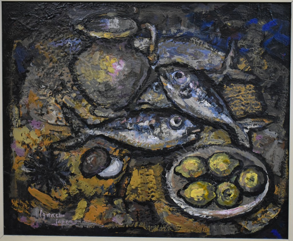 En un momento de nuestra conversación – pocos días antes de morir –, el buen Pintor Ignacio López se levantó y fue hasta una habitación de su casa con cuadros suyos depositados en el suelo… Cogió un bodegón y me lo entregó diciendo solamente: Para ti. Y me lo dedicó y rubricó en el reverso.